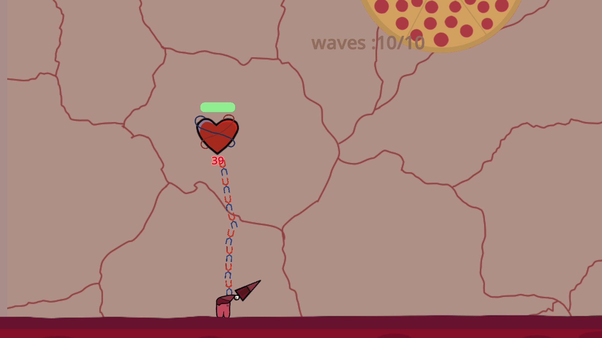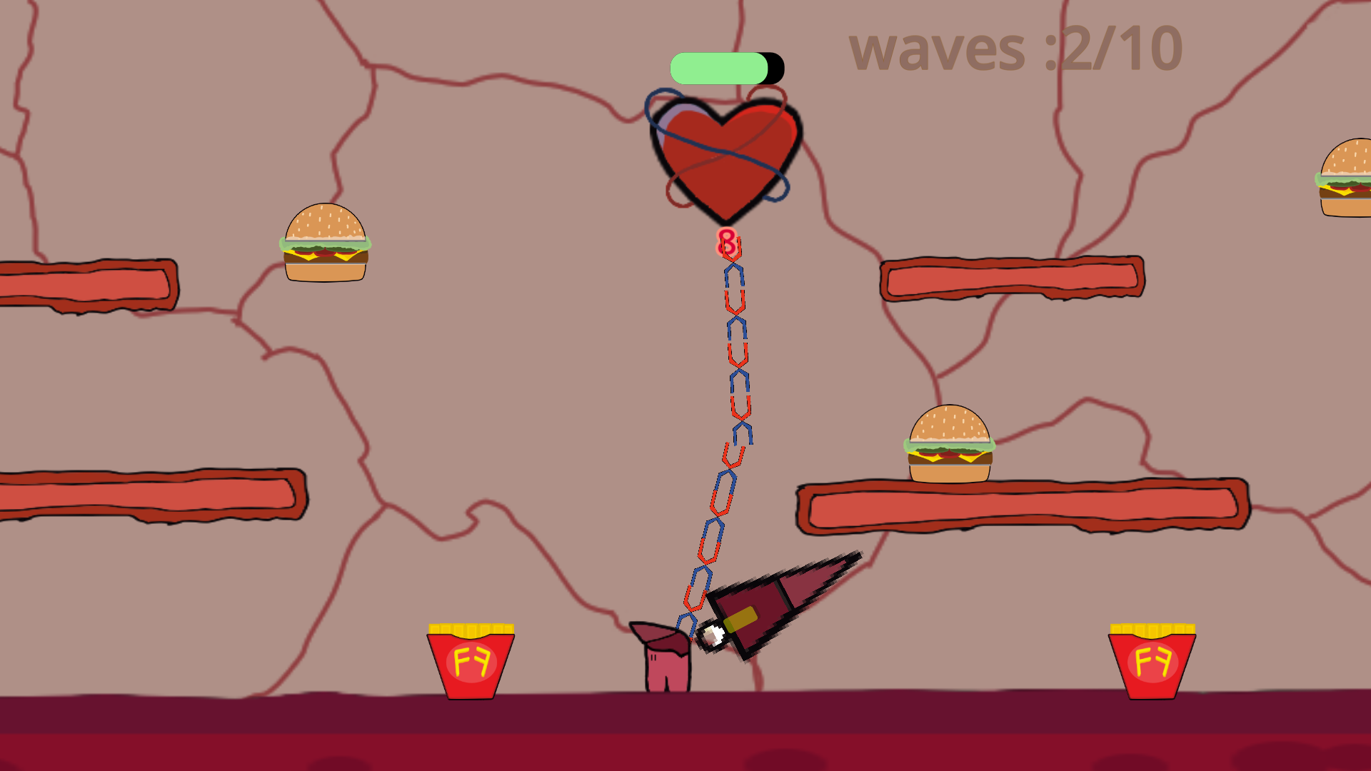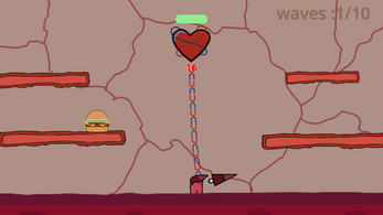 You are an organ soldier, SOLDIER LIVER. You cannot die till the heart is destroyed.Your duty is to protect the heart from junk food.You can only die when the heart dies. Your weapon can grow after collecting High calories from the defeated fast foods.You can move vertically by pulling the chain/DNA link between you and heart. Survive the waves of food and live on to see another day!